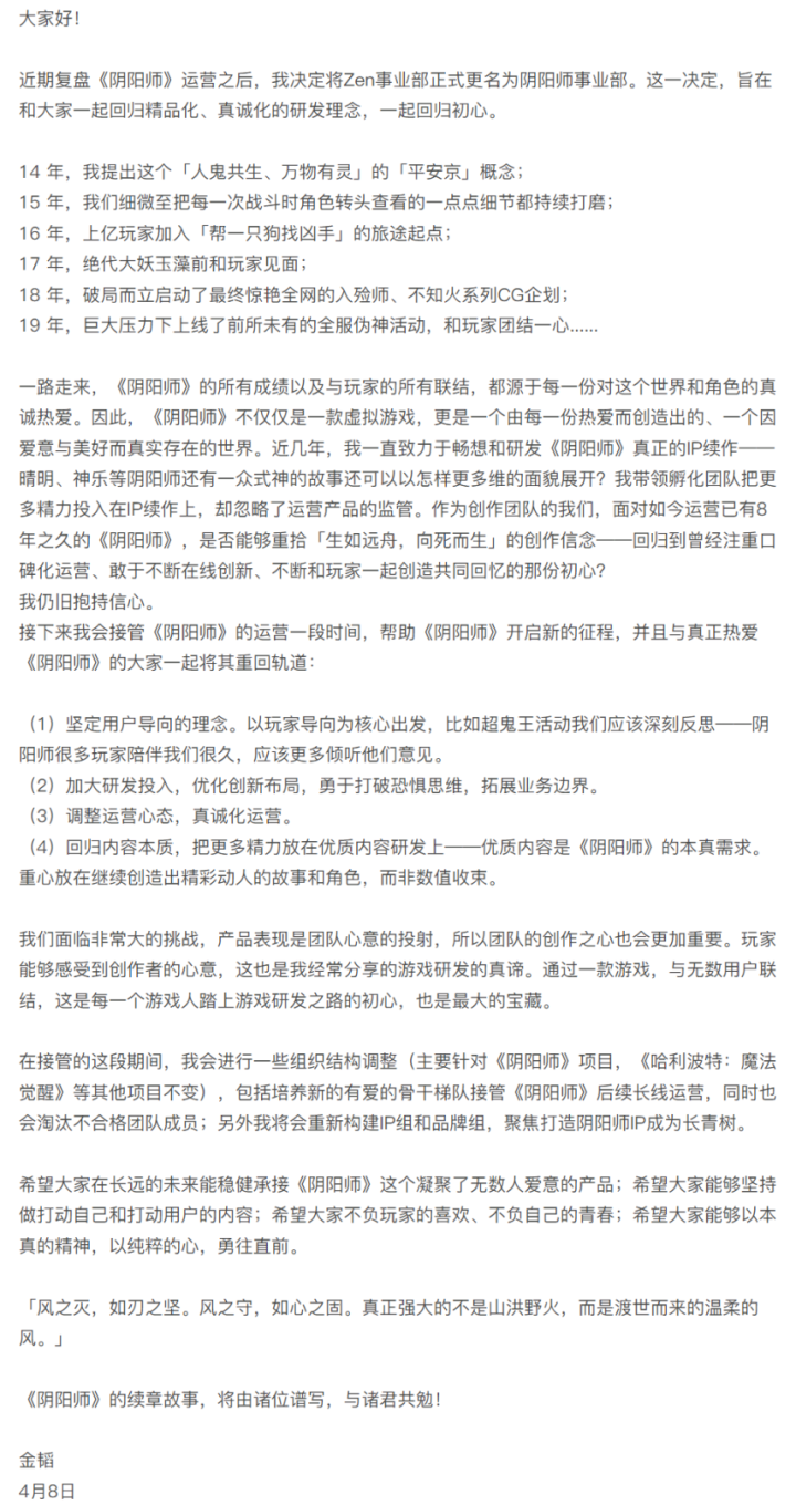 虽然在4月份左右他短暂地重返项目,发表了一封内部信,表示Zen事业部将更名为阴阳师事业部,救火当时因「超鬼王活动」口碑塌房的《阴阳师》,不过后续还是离开了网易。