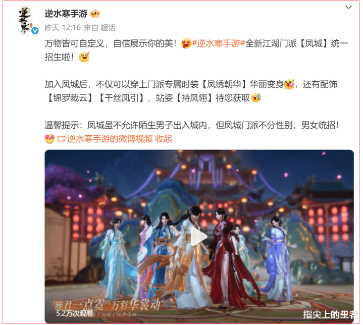 带头的正是最爱整活的《逆水寒》手游官方!其实早在之前的主线剧情中,不少玩家就已经接触过这个江湖门派,当时便被折服纷纷想要加入体验,这回官方将“凤城”全面升级,直接开招全体男女玩家!
