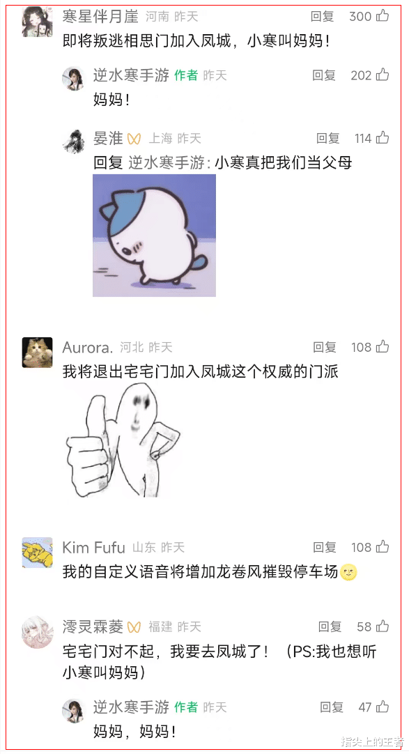 而就在最近《逆水寒》手游的玩家们,直接把源自“瓦学弟”的梗来了一个大升级!事情的起因是这款新游官宣,即将在8月29日本周五七夕佳节的更新中,加入全新江湖门派“凤城”,在看完这个集美貌、实力与安全感于一身的新门派后,不少玩家迫不及待的喊出了“妈妈”。