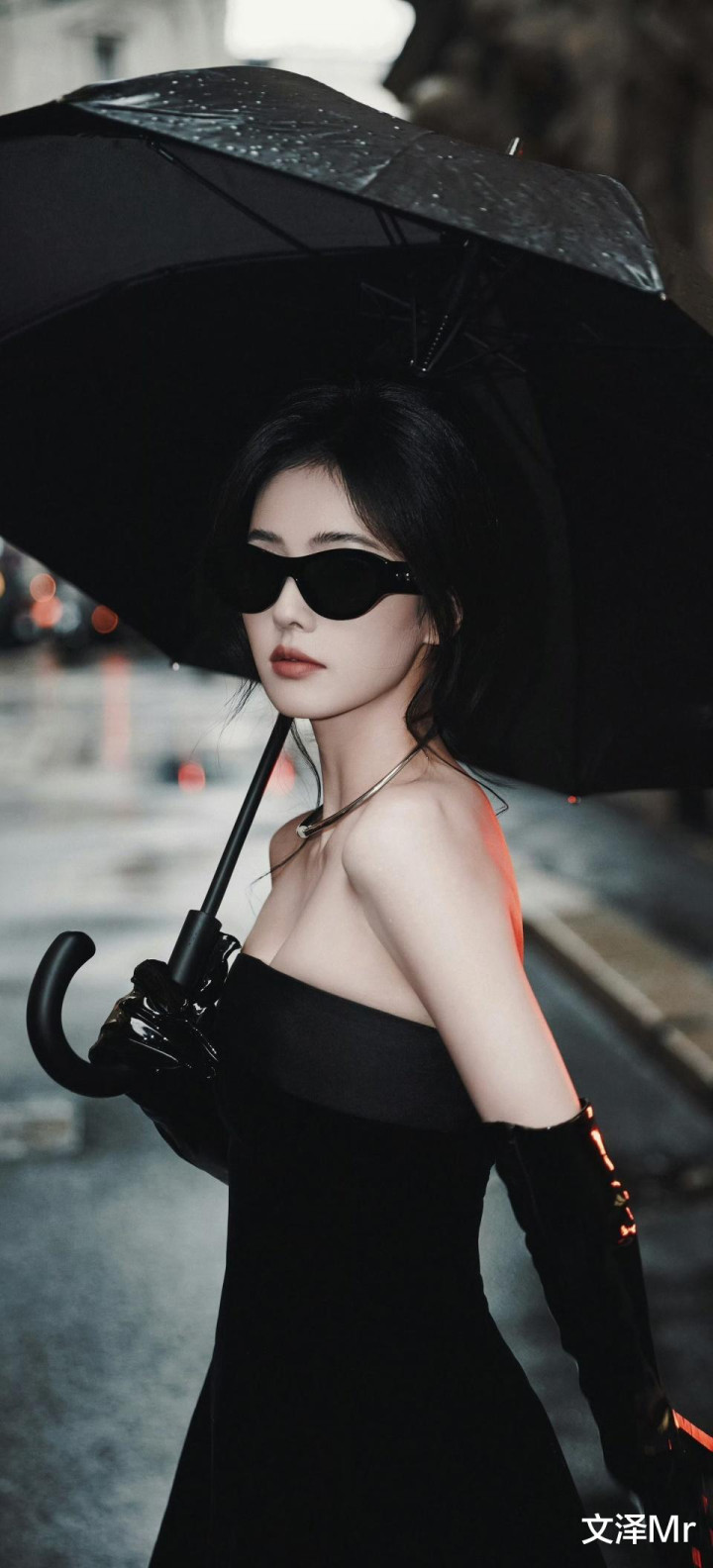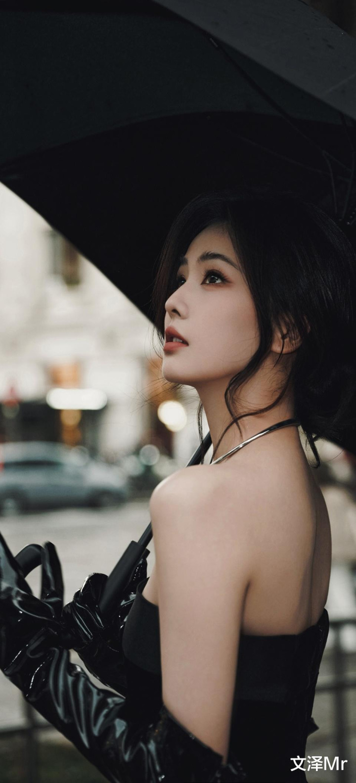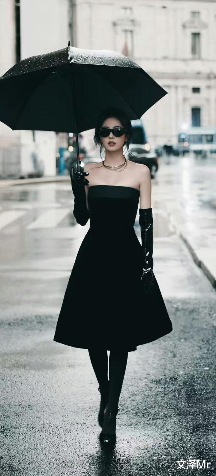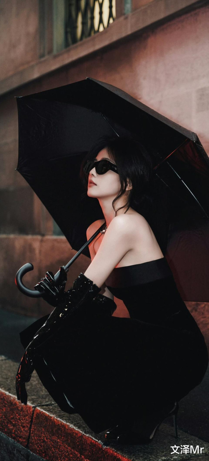 白鹿一袭黑色抹胸长裙倚靠伞下,乌黑秀发随意挽起,几缕发丝勾勒出慵懒韵味。最绝的是她望向远方的眼神——没有刻意张扬,却自带故事感。仿佛刚从复古电影中走来,每一个细节都在诉说优雅。
