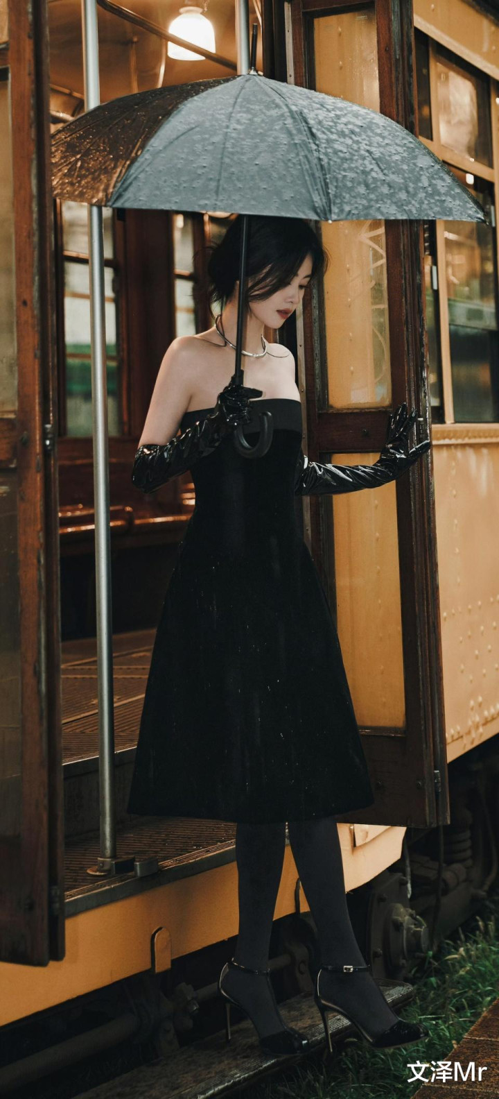 黄色车厢与黑裙形成强烈撞色。她扶车门的姿态让人想起《罗马假日》的经典场景,但雨伞上的水珠又增添现代摩登感。这种古今交融的时尚语言,正是白鹿团队的拿手好戏——毕竟从抖音古装女神到现代剧女主,她始终擅长打破时空界限。