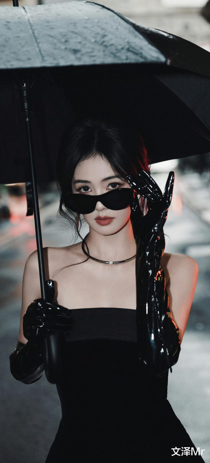 这张氛围感拉到极致。伞面雨滴坠落,墨镜后若隐若现的眼神与锁骨线条形成奇妙呼应。这种“不费力的时尚”恰恰最考验功底——就像她饰演的角色,无论活泼还是清冷,都能让人相信“她就是角色本身”。