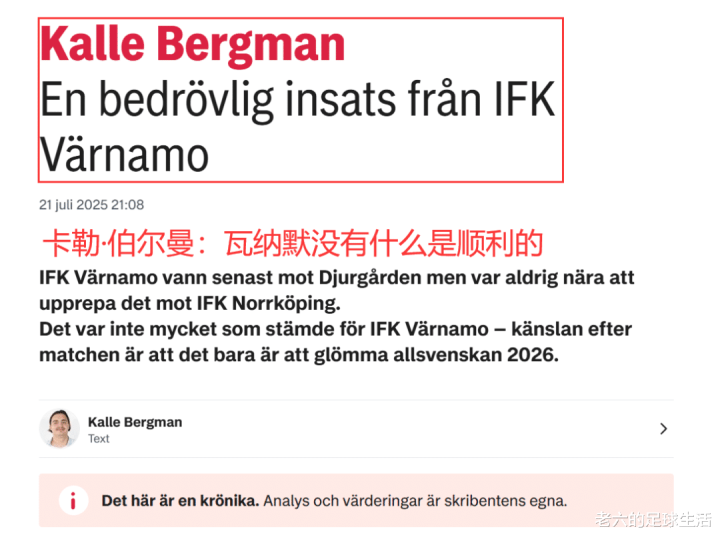 这个赛季IFK瓦纳默的表现非常糟糕,专栏作者凯恩·伯尔曼发文称对于瓦纳默来说没有什么是顺利的,没有任何迹象表明球队有机会继续留在瑞典超。