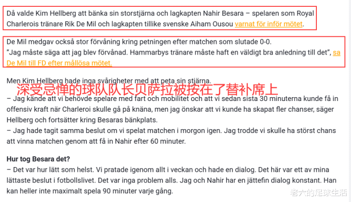 哈马比这边上场的欧战面对沙勒罗瓦,主教练海尔伯格的阵容安排让所有人感到奇怪。