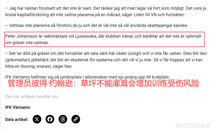 训练场的管理员彼得·约翰逊表示如果不能浇水,草坪会枯死变硬,这会让球员有更高的受伤风险。