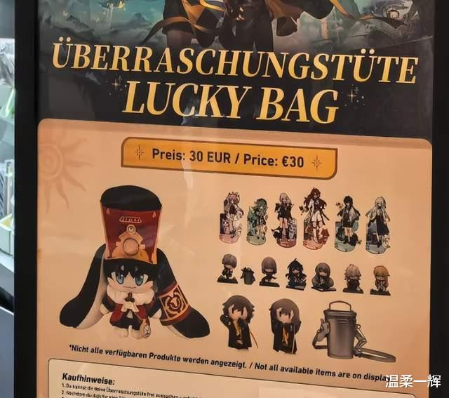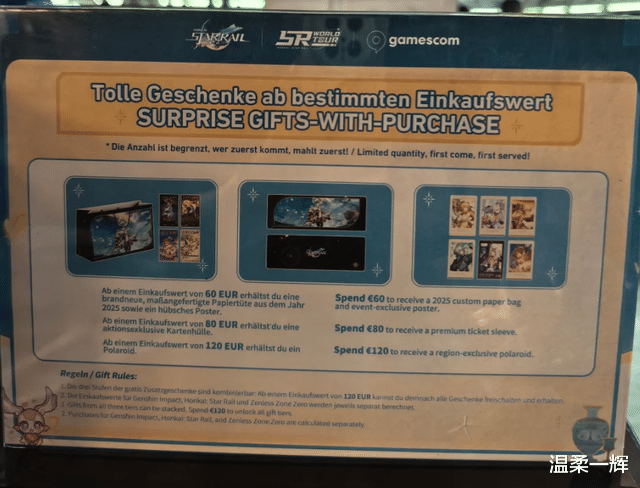 就拿崩铁展位的周边来说吧,不仅有30欧的福袋,还有60欧、80欧、120欧三个满赠档位。其中60欧送购物袋和海报,80欧送一个镭射票套组、120欧送6个翁法罗斯拍立得套组。