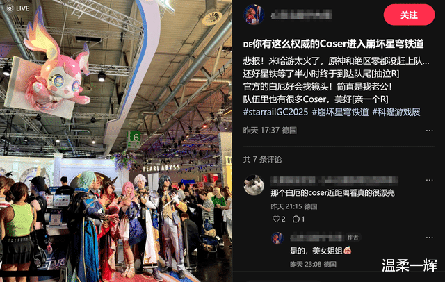 根据到场海外玩家的反馈,星铁展台非常热闹,她排队半小时才排到队尾。好在,排队过程中有许多海外Coser,官方的Coser团队也非常配合,所以尽管排队很枯燥,但整个过程还蛮赏心悦目的。