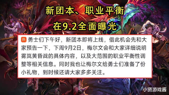 首先,9.2发布的梅尔文公告,会侧重的给玩家讲解雾岚黄昏战团本,以及职业平衡这2大内容。雾岚黄昏战目前由于奖励拉胯,没有贴膜,以及太过卷需要8.0的原因,遭到玩家的嗤之以鼻。