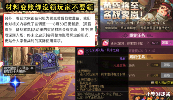 备战活动调整后,会对大深渊票改成账绑模式,这个说实话在活动上线的时候就应该变成调整了,传说跨界石,深渊通行证都是账绑,大深渊票不是,实属是策划考虑不周,跟备战这一词是相悖的。
