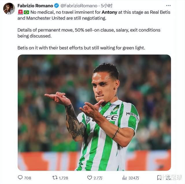 TA在文章中指出,安东尼在曼联的年薪约为700万欧元,2年1400万欧元。贝蒂斯提供500万欧元的年薪,这已是极限。安东尼希望弥补400万的工资差价,贝蒂斯没钱补,曼联不愿补。