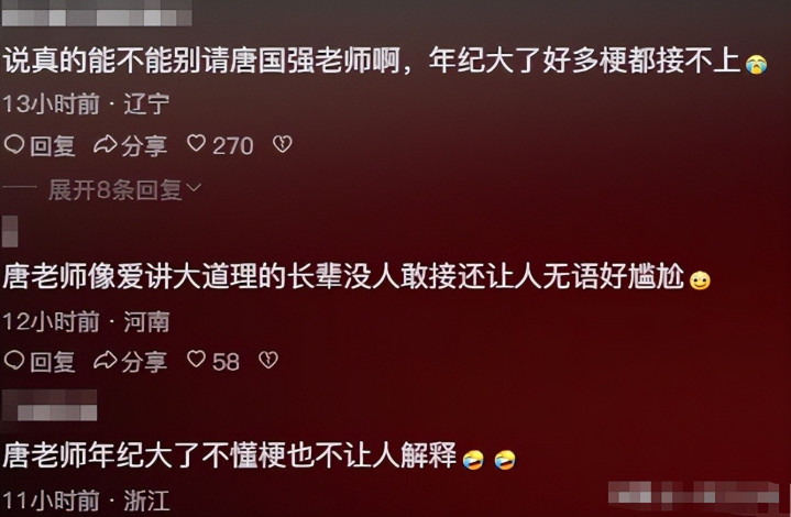 在节目中,唐国强的辈分让许多观众认为他的存在让年轻嘉宾略显拘谨。
