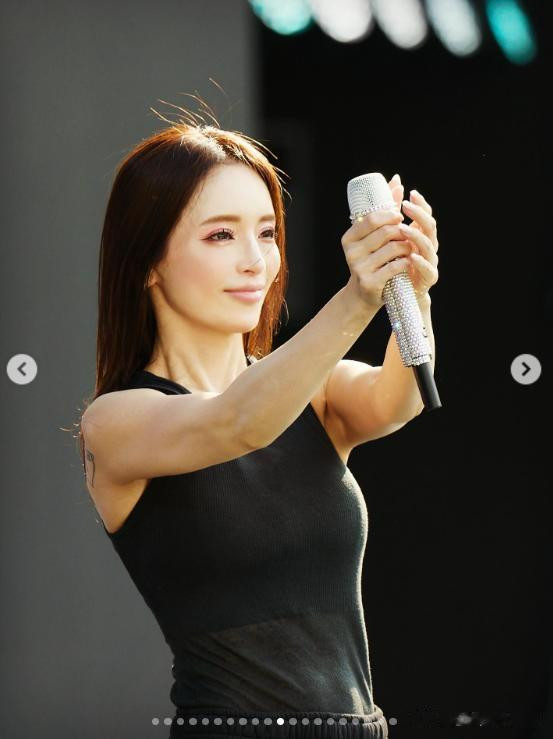 照片中她穿着黑色背心,表情认真地握着麦克风。紧致的身材十分吸睛,右肩的纹身也若隐若现。