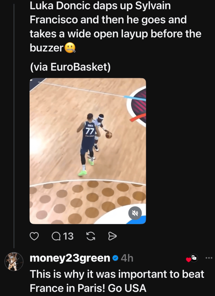 勇士球员德雷蒙德-格林在发布这则消息动态的美媒bballunlocked下评论写道:“这就是为什么在巴黎击败法国如此重要!USA加油!”