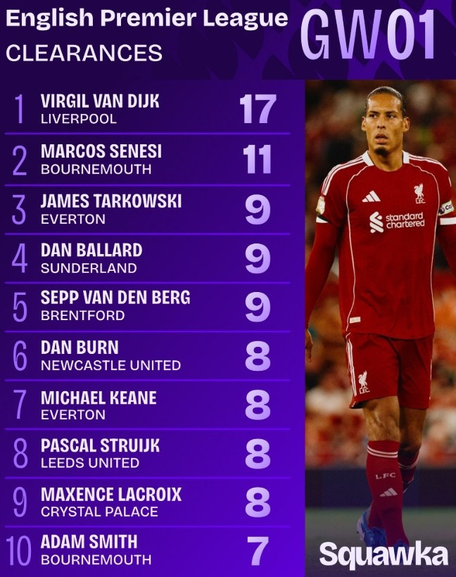 直播吧8月20日讯新赛季英超首轮比赛已经结束了全部争夺,根据Squawka的数据统计,利物浦中卫范迪克是本轮解围次数最多的球员。