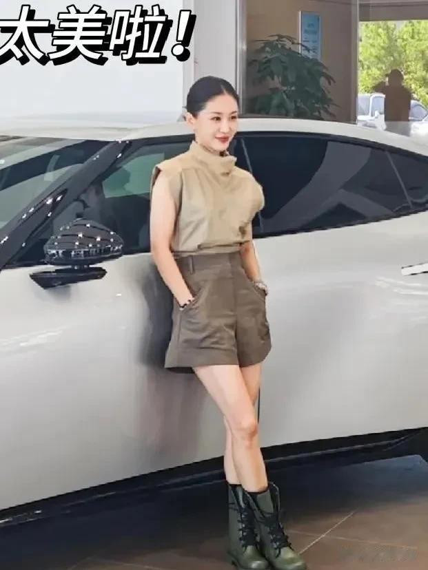 王子文上身穿着卡其色无袖高领款式的上衣 ,下身搭配一条棕色短裤,脚穿一双墨绿色的中筒靴,人整体看起来比较高挑,尤其显得腿长,这也是王子文常见的装扮。