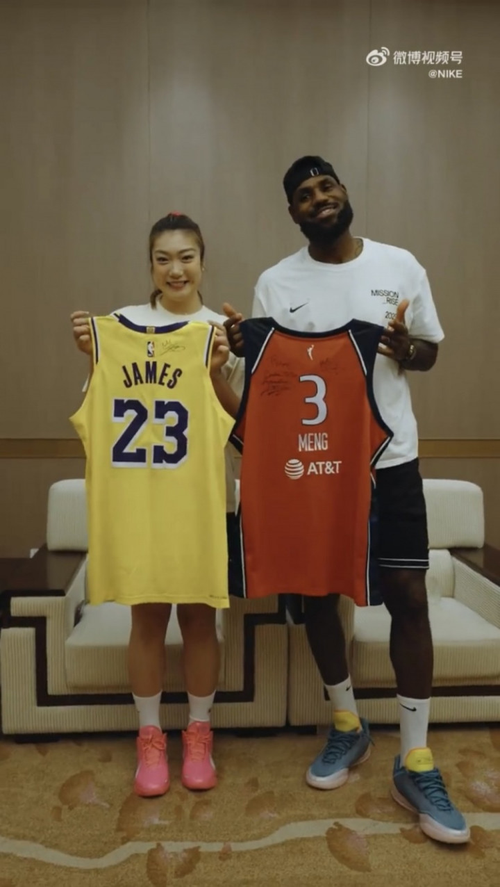 “追星天花板!‘勒布朗梦’@女篮李梦梦幻同框勒布朗·詹姆斯”耐克官博写道。
