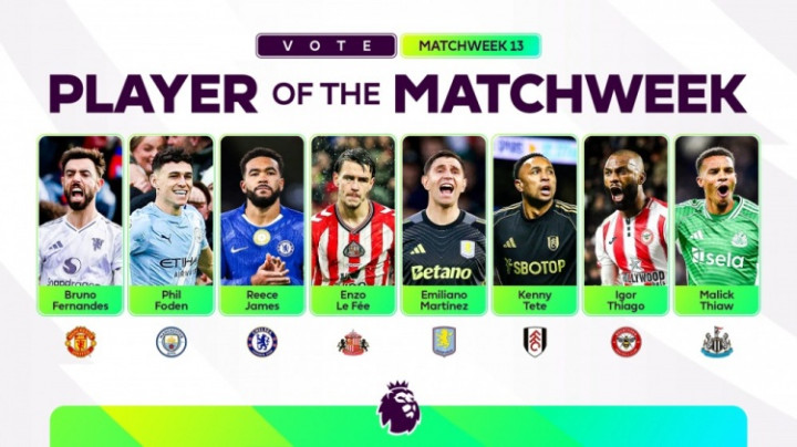 直播吧12月2日讯英超官方公布了第13轮最佳球员的八人候选名单,B费、福登、里斯·詹姆斯等人入选。